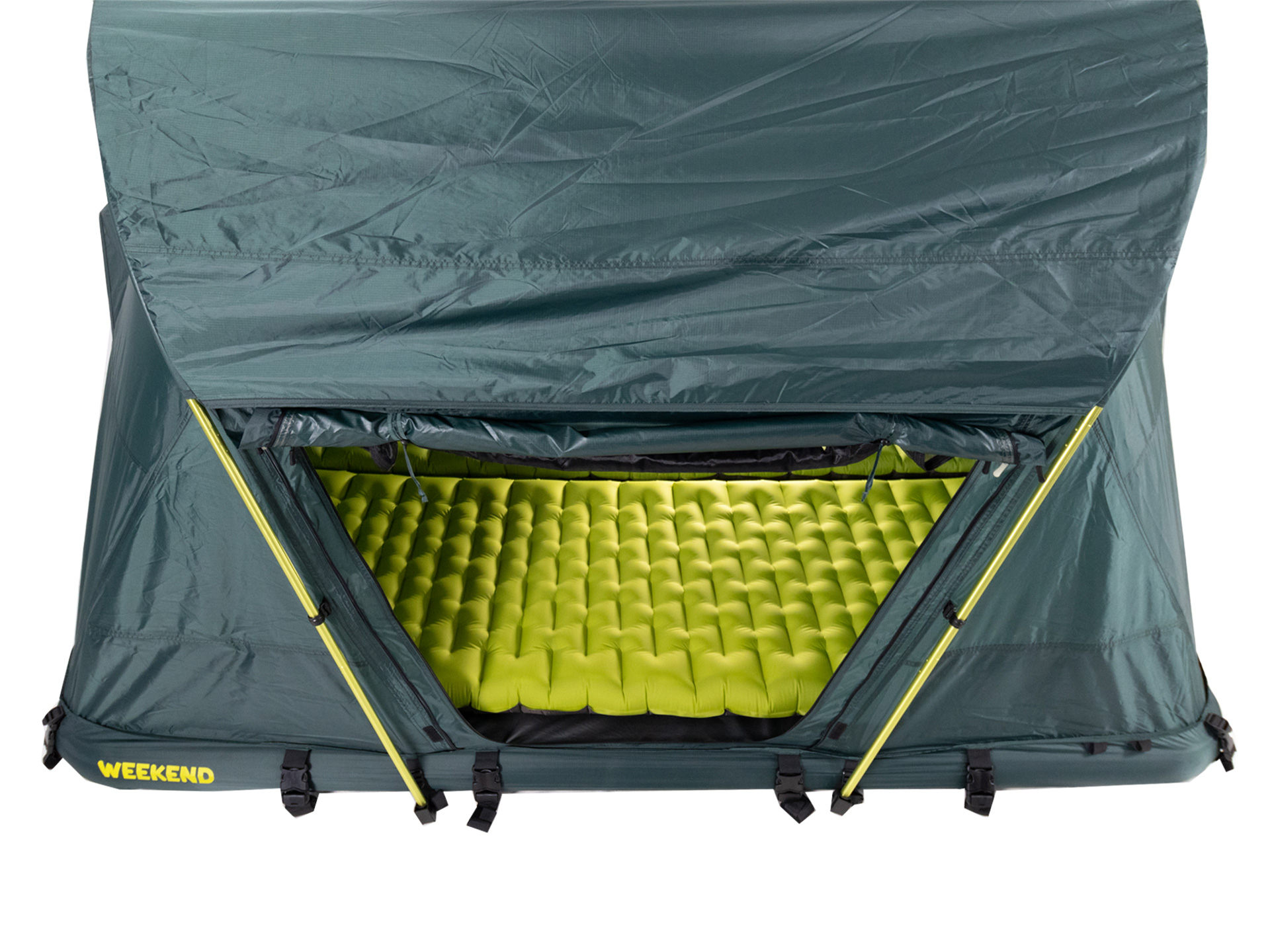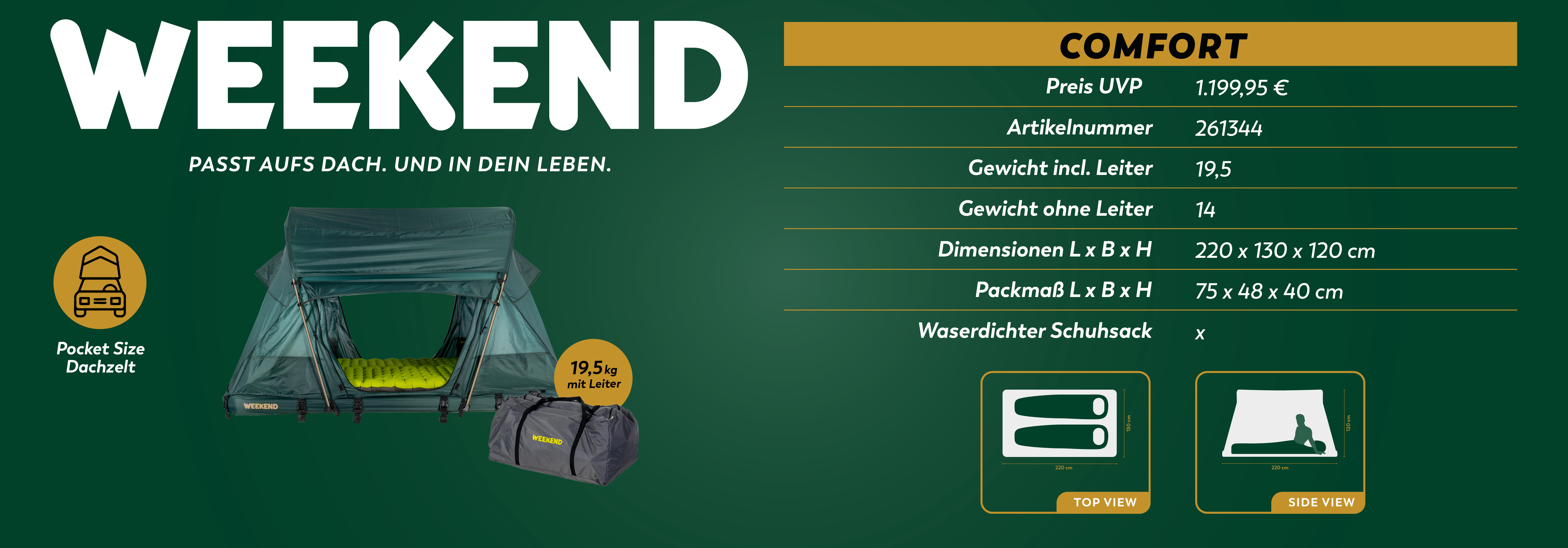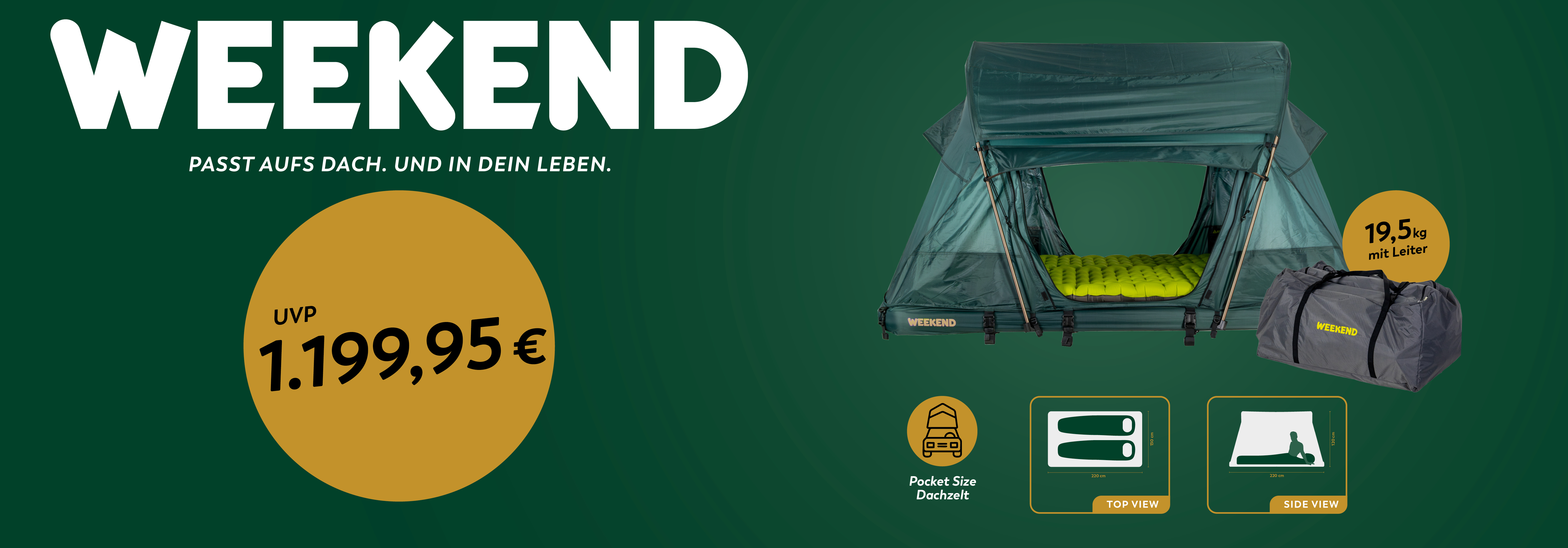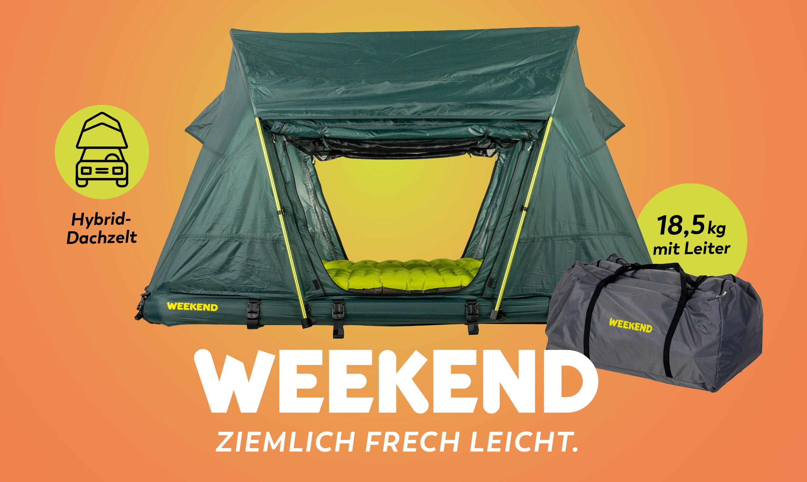 Dachzelten soll einfacher, erschwinglicher, alltäglicher sein als bisher. Wir lieben es auf dem Dach zu schlafen, aber so wie es bisher ist, ist es zu umständlich, zu schwer und zu teuer. Nicht umsonst ist so ein durchschnittlicher Dachzelt - Besitzer meist auch Einfamilienhaus- Besitzer. Und jenseits der 40. Und männlich. Für ihn und seine Bedürfnisse gibt es zahlreiche, großartige Zelte im Markt. Aber nicht für uns und unsere Bedürfnisse. Die sehen gänzlich anders aus. Wir wollen keine Weltreise planen, keine Unsummen in Equipment stecken, wir wollen auch kein Haus auf dem Auto spazieren fahren. Wir wollen lachend ins Wochenende starten, am liebsten schon Donnerstag. Badehose in der einen Hand, das Dachzelt in der anderen und dann los Richtung Sonnenuntergang. Und wenn das Wochenende vorbei ist, verschwindet es im Schrank. Zusammen mit all den anderen lustigen Sachen, die für uns Abenteuer bedeuten. Das WEEKEND macht alles anders. Es ist einfach zu tragen, einfach zu montieren, einfach zu verstauen. Seine Bodenplatte wird aufgepumpt, wie du es vom SUP kennst, mit der mitgelieferten Pumpe oder einem Kompressor. Dann einfach das Gestänge durchfädeln und schon kann das Zelt aufs Auto geworfen werden. Schnell noch mit Reling und Leiter verzurren und fertig ist die Wochenendlaube. Das Ganze dauert nur ein paar Minuten, mit Kompressor kannst du nebenbei schon den ersten Kaffee trinken. Und dann kann es losgehen. Platz für zwei und eine Aussicht für Millionen. Nicht wegen den zwei großen Seiteneingängen, die haben alle. Sondern wegen dem fantastischen SkyView Dach, das dir in schönen Nächten einen freien Blick auf den Sternenhimmel bietet. Das hat wohl kaum ein Dachzelt sonst.
