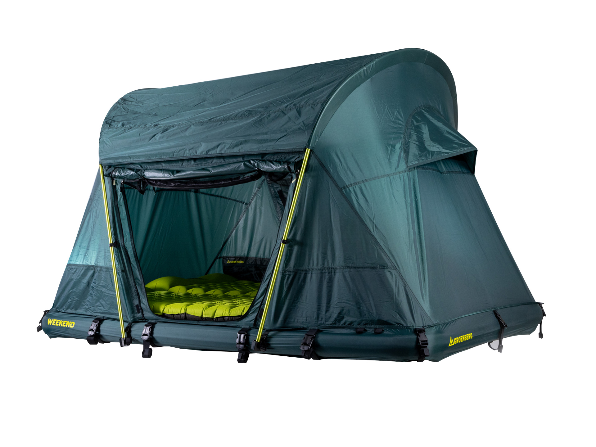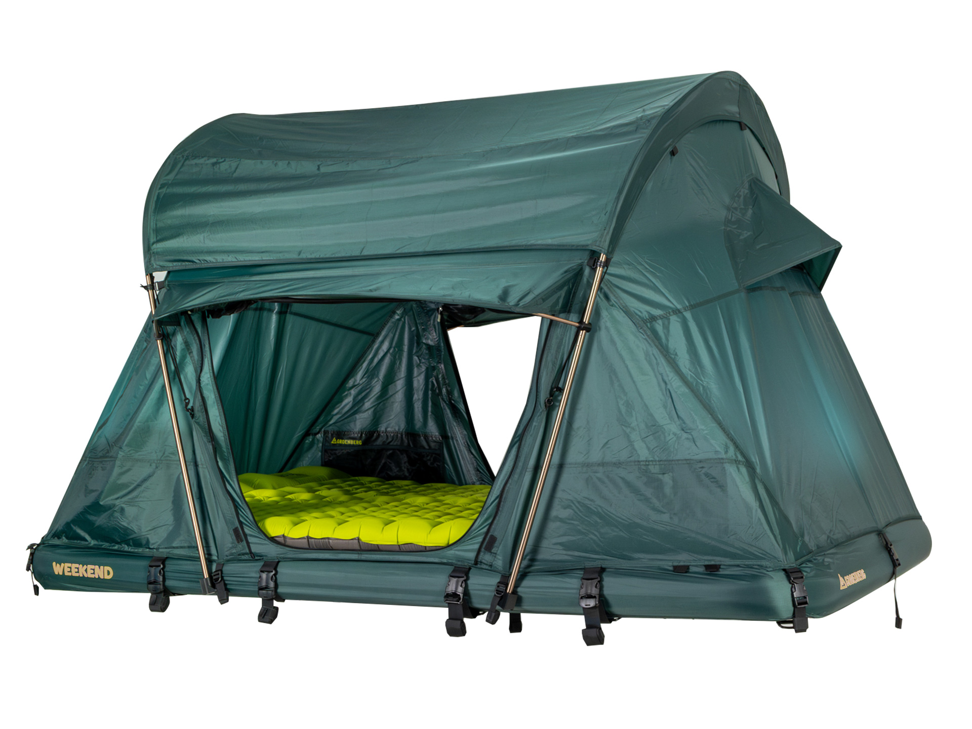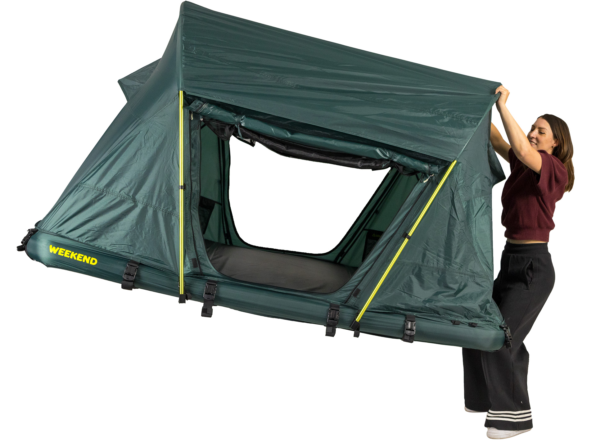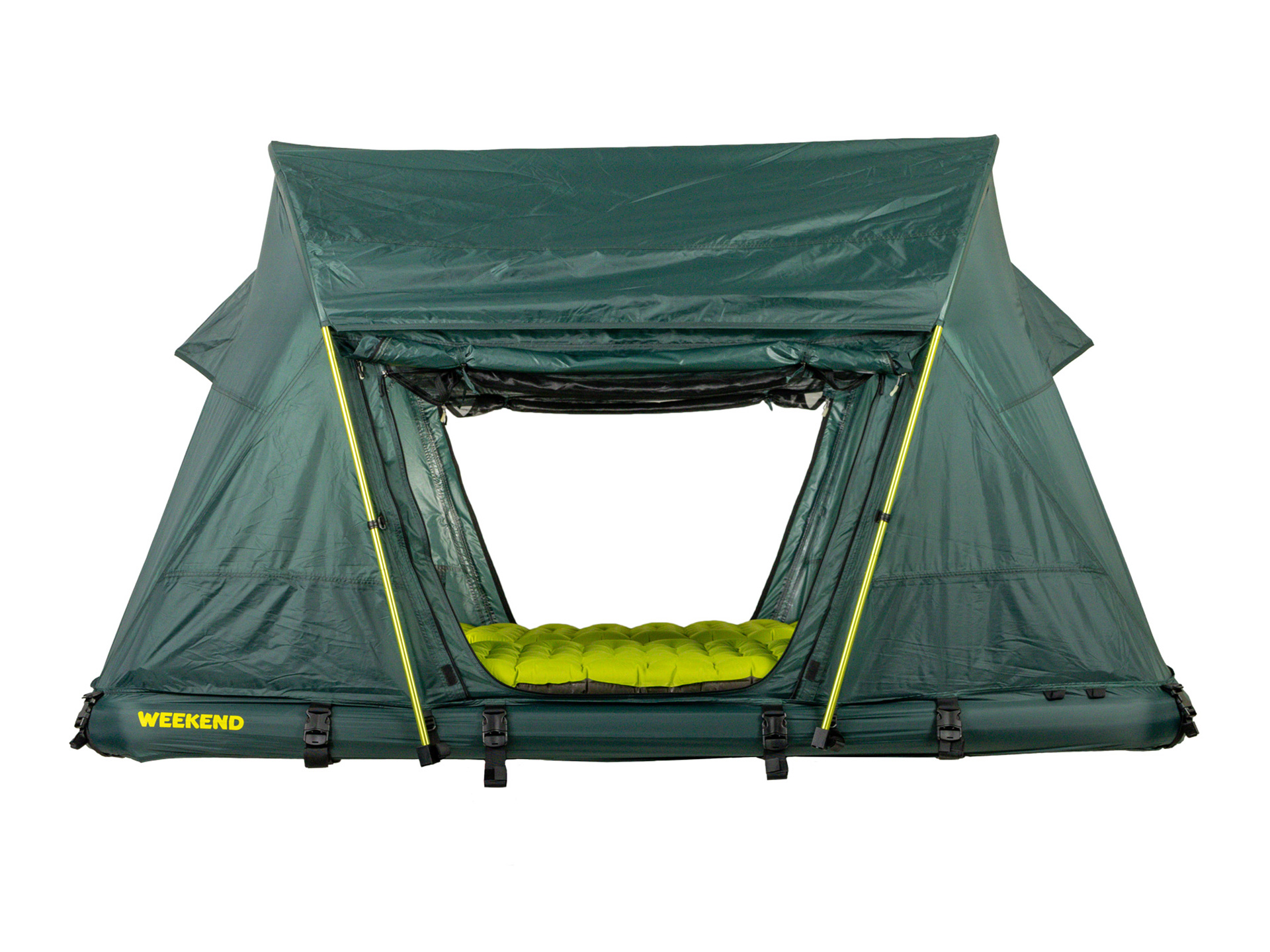 Dachzelten soll einfacher, erschwinglicher, alltäglicher sein als bisher. Wir lieben es auf dem Dach zu schlafen, aber so wie es bisher ist, ist es zu umständlich, zu schwer und zu teuer. Nicht umsonst ist so ein durchschnittlicher Dachzelt - Besitzer meist auch Einfamilienhaus- Besitzer. Und jenseits der 40. Und männlich. Für ihn und seine Bedürfnisse gibt es zahlreiche, großartige Zelte im Markt. Aber nicht für uns und unsere Bedürfnisse. Die sehen gänzlich anders aus. Wir wollen keine Weltreise planen, keine Unsummen in Equipment stecken, wir wollen auch kein Haus auf dem Auto spazieren fahren. Wir wollen lachend ins Wochenende starten, am liebsten schon Donnerstag. Badehose in der einen Hand, das Dachzelt in der anderen und dann los Richtung Sonnenuntergang. Und wenn das Wochenende vorbei ist, verschwindet es im Schrank. Zusammen mit all den anderen lustigen Sachen, die für uns Abenteuer bedeuten. Das WEEKEND macht alles anders. Es ist einfach zu tragen, einfach zu montieren, einfach zu verstauen. Seine Bodenplatte wird aufgepumpt, wie du es vom SUP kennst, mit der mitgelieferten Pumpe oder einem Kompressor. Dann einfach das Gestänge durchfädeln und schon kann das Zelt aufs Auto geworfen werden. Schnell noch mit Reling und Leiter verzurren und fertig ist die Wochenendlaube. Das Ganze dauert nur ein paar Minuten, mit Kompressor kannst du nebenbei schon den ersten Kaffee trinken. Und dann kann es losgehen. Platz für zwei und eine Aussicht für Millionen. Nicht wegen den zwei großen Seiteneingängen, die haben alle. Sondern wegen dem fantastischen SkyView Dach, das dir in schönen Nächten einen freien Blick auf den Sternenhimmel bietet. Das hat wohl kaum ein Dachzelt sonst.