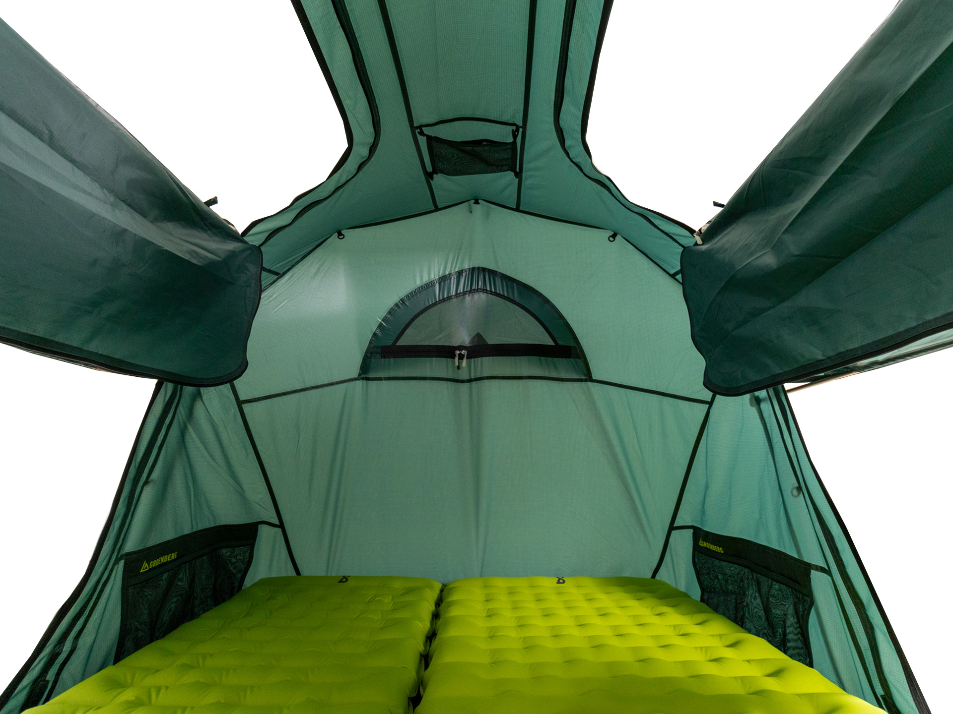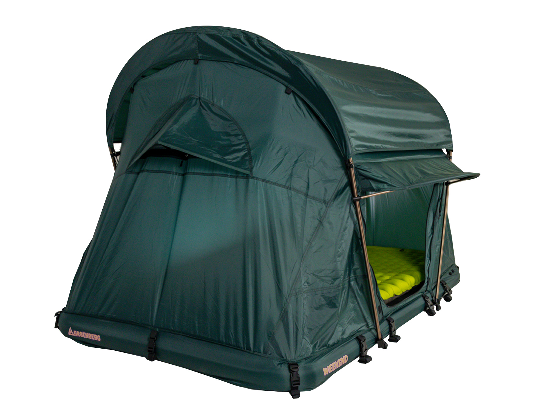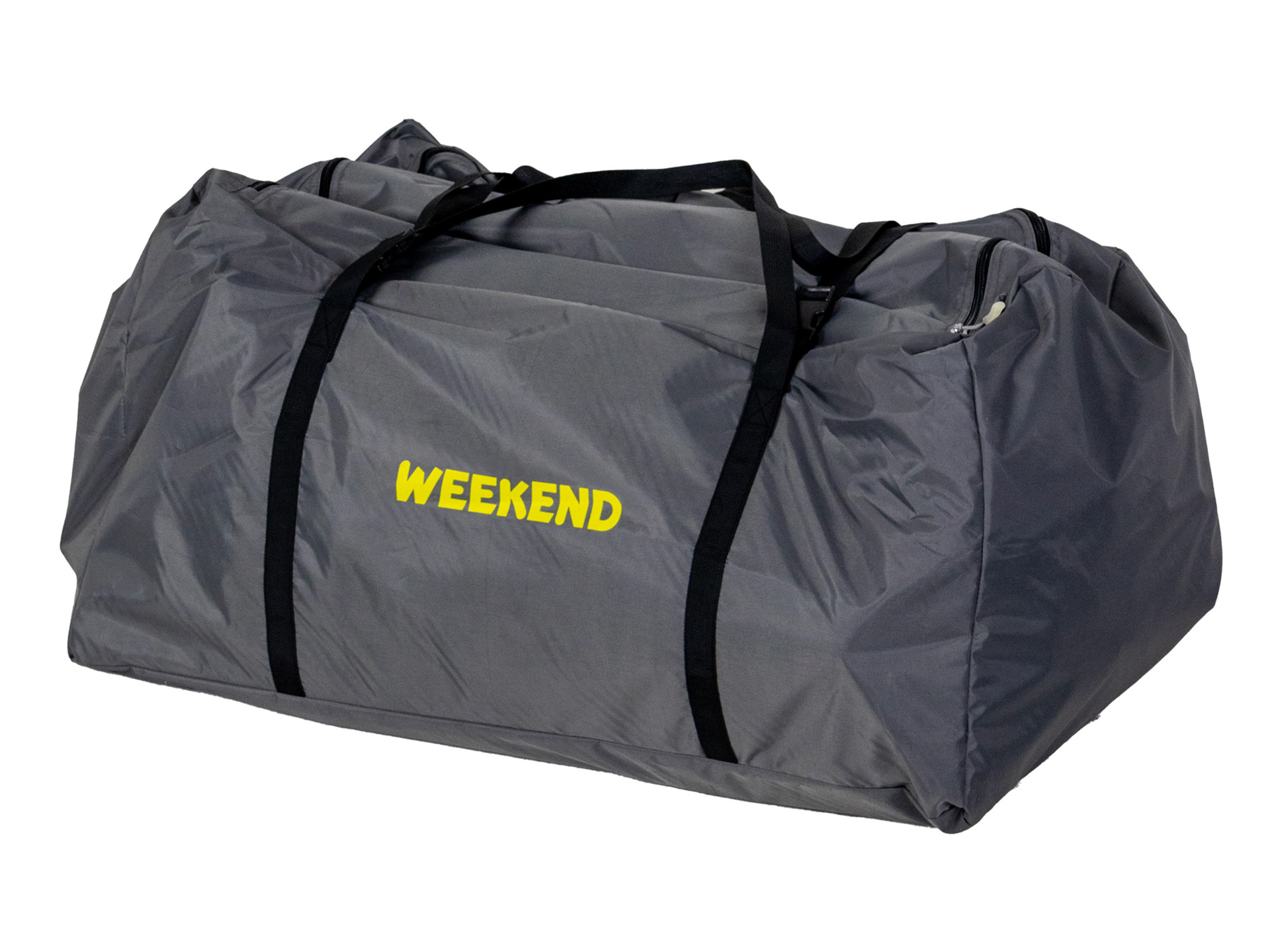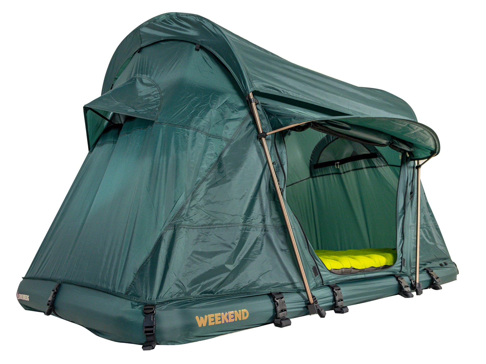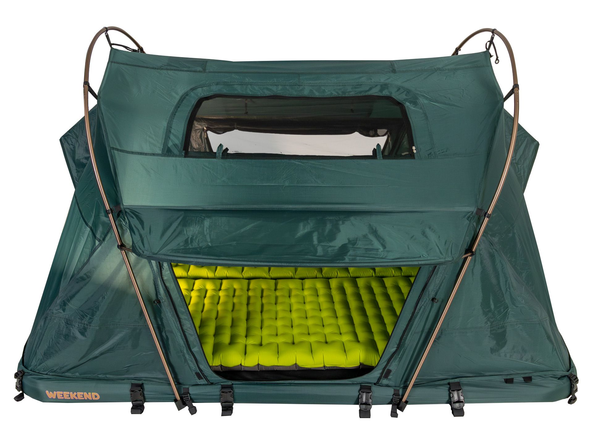 Dachzelten soll einfacher, erschwinglicher, alltäglicher sein als bisher. Wir lieben es auf dem Dach zu schlafen, aber so wie es bisher ist, ist es zu umständlich, zu schwer und zu teuer. Nicht umsonst ist so ein durchschnittlicher Dachzelt - Besitzer meist auch Einfamilienhaus- Besitzer. Und jenseits der 40. Und männlich. Für ihn und seine Bedürfnisse gibt es zahlreiche, großartige Zelte im Markt. Aber nicht für uns und unsere Bedürfnisse. Die sehen gänzlich anders aus. Wir wollen keine Weltreise planen, keine Unsummen in Equipment stecken, wir wollen auch kein Haus auf dem Auto spazieren fahren. Wir wollen lachend ins Wochenende starten, am liebsten schon Donnerstag. Badehose in der einen Hand, das Dachzelt in der anderen und dann los Richtung Sonnenuntergang. Und wenn das Wochenende vorbei ist, verschwindet es im Schrank. Zusammen mit all den anderen lustigen Sachen, die für uns Abenteuer bedeuten. Das WEEKEND macht alles anders. Es ist einfach zu tragen, einfach zu montieren, einfach zu verstauen. Seine Bodenplatte wird aufgepumpt, wie du es vom SUP kennst, mit der mitgelieferten Pumpe oder einem Kompressor. Dann einfach das Gestänge durchfädeln und schon kann das Zelt aufs Auto geworfen werden. Schnell noch mit Reling und Leiter verzurren und fertig ist die Wochenendlaube. Das Ganze dauert nur ein paar Minuten, mit Kompressor kannst du nebenbei schon den ersten Kaffee trinken. Und dann kann es losgehen. Platz für zwei und eine Aussicht für Millionen. Nicht wegen den zwei großen Seiteneingängen, die haben alle. Sondern wegen dem fantastischen SkyView Dach, das dir in schönen Nächten einen freien Blick auf den Sternenhimmel bietet. Das hat wohl kaum ein Dachzelt sonst.